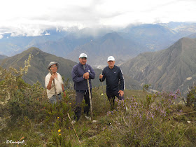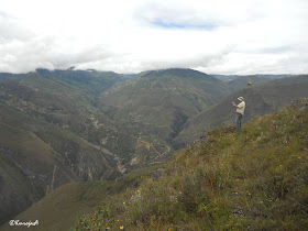 Desde la segunda cumbre, donde degustamos el refrigerio, confundimos a un ave de regular tamaño que ostentosamente sobrevolaba esos inmensos espacios aéreos con un legendario cóndor, lastimosamente y a pesar de nuestro deseo, desde hace muchas décadas ya no se tiene rastros de existencia de esas aves míticas, encontramos más bien, restos de construcciones pre incas que coronaban a esa cima del cerro, aunque deterioradas y tapadas con tierra y monte, y variedad de piezas de cerámica rústica. Muchas vistas se tomaron, y cuánto extrañé y sentí no contar con mi inseparable cámara que, dos noches antes, desapareció de mis propias manos; observamos a lo lejos el elevado cerro Punta Grande erguido sobre el río Marañón, al que vistamos el año anterior.