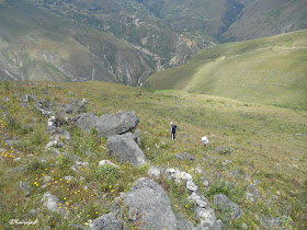 Brevemente dimos gracias a la madre tierra por permitirnos recorrerla y brindarnos la posibilidad de seguir viviendo sobre ella, e iniciamos el retorno por el extremo opuesto al de venida, que por cierto tampoco fue fácil, pues en gran parte bajamos haciendo camino hasta llegar al borde de una inmensa y bella pampa verde conocida como Hierbabuena, enclavada en medios de grandes cerros y con una pequeña laguna reconstruida al centro. Otra similar, aunque de menor tamaño ubicamos más adelante, realmente llamativas y prodigiosas esas vastas planicies naturales.