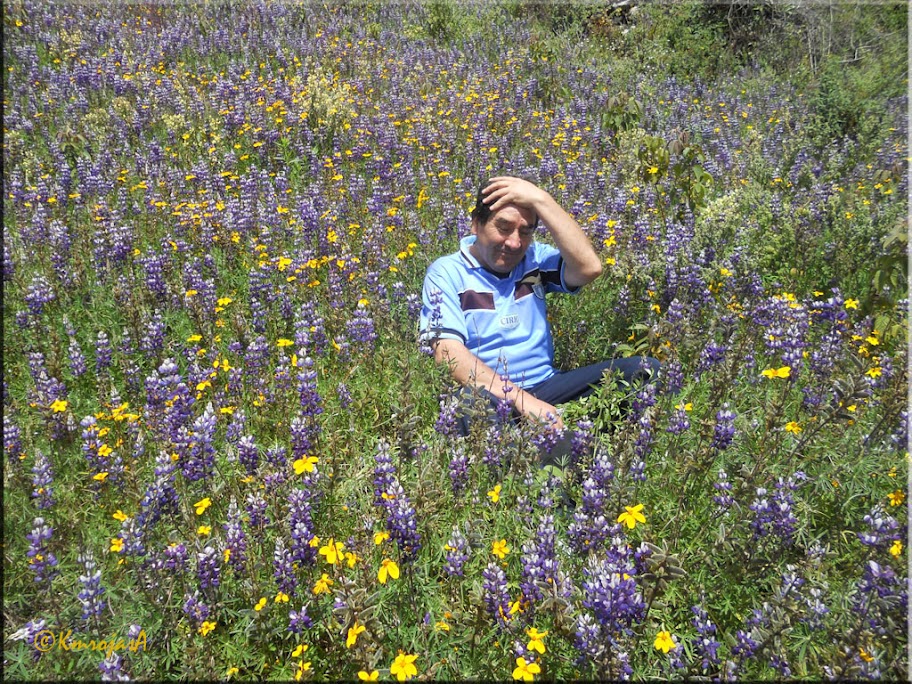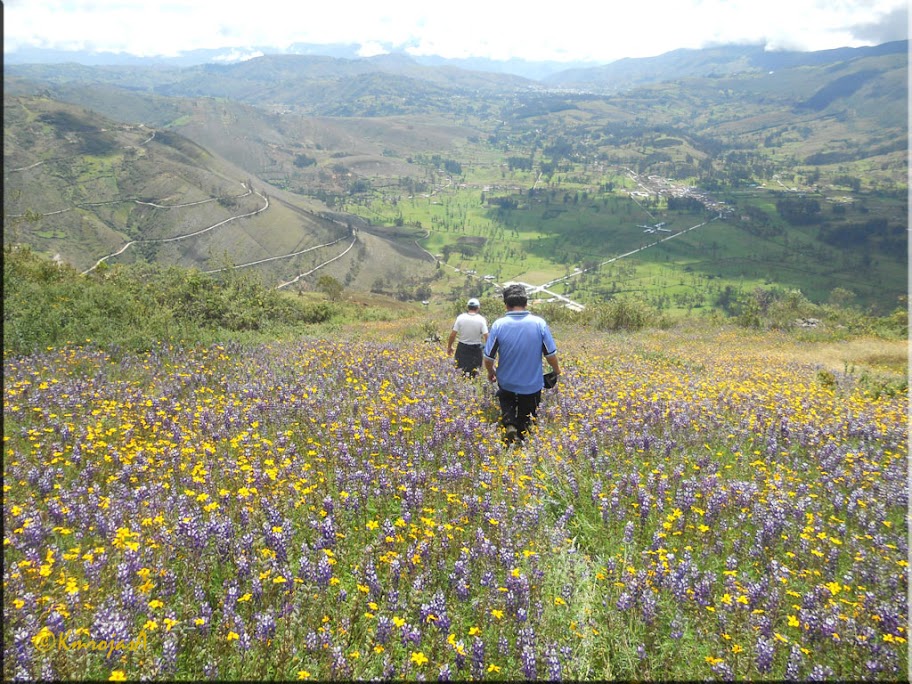 Sin mayores comentarios, iniciamos el descenso con dirección a la cruz, de pronto, entre una lomas nos encontramos con un terreno llenó de flores silvestres con precioso contraste amarillo y azul, nos fue imposible resistirnos a eternizar ese momento ante tamaña alfombra natural.