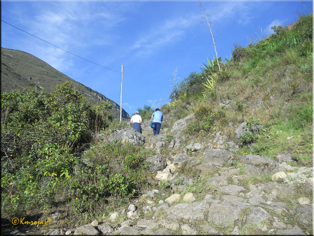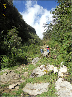 Después de algunas fotos, eternizando el instante y poder mostrarlas posteriormente, volvimos al lugar donde nos esperaba Gonzalo. Continuamos con el ascenso sobre el pedregoso camino cual escalinatas bien talladas y macizas, entre algunas curvas y sendero recto pero siempre en subida, discurrimos por el lugar llamado “La mala muerte”, seguimos caminando en un entorno más estrecho, donde el camino, se hace más impresionante y único… entonces, la escalera de piedra desciende un poco, cruza la quebrada de la Quintilla, asciende un trecho en sentido contrario, como si alcanzara el cielo para luego, entre rocas impresionantes y vegetación exuberante, voltear con dirección al Caserío de La Laguna…