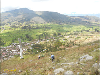 Llegamos a la cruz, a un costado de ella en una pequeña "pampita" de verde pasto, descansamos un poco recordando todo lo arduo del camino. De ese lugar, bajamos, por un angosto sendero, acompañados de una pequeña lluvia, cruzamos un bosque de eucaliptos jóvenes hasta la “Sequia Madre”, caminamos un trecho en uno de su bordes y bajamos con dirección a la plaza de Sucre buscando una "chingana" para disfrutar de unos sabrosos chicharrones con mote y ají molido en batán…