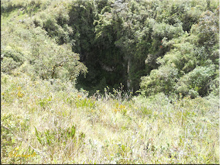Desde esa ubicación se alcanzaba a ver gran parte de la campiña de los pueblos de Sucre, José Gálvez, su entorno y mucho más… Después de las “tomas fotográficas”, descansar un poco y comer los sabrosos tamales que Martha nos preparó seguimos con nuestra agradable caminata sobre el Huishquimuna… Como que bajando a una hondonada, entonces, nos encontramos con algo sorprendente, algo más que la generosa naturaleza nos tenía reservado para ese día. Entre arbustos y rocas se presentó ante nuestros ojos, un “Talalán”, otro cráter, pero esta vez, con apariencia diferente, una sima parecida a las que hay en el Tepuy de Sarisariñama, en Venezuela; El cráter, sima o talalán denotaba un corte vertical en la roca por alguna fuerza desconocida y a diferencia del anterior, el de Silvapampa, de difícil acceso, pudimos calcular aproximadamente unos 40 metros de diámetro y su profundidad difícil de precisar, puesto que su base está cubierta de mucha vegetación. Nos quedamos contemplando esta maravilla natural y…