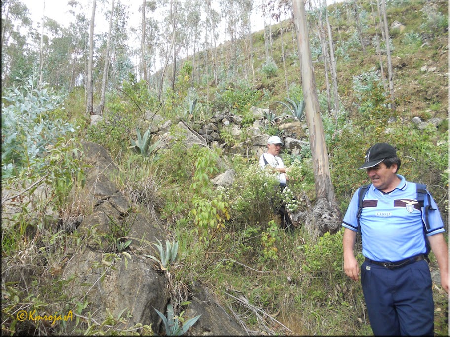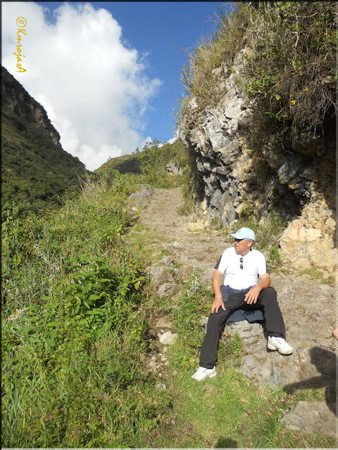 Después de algunas fotos, eternizando el instante y poder mostrarlas posteriormente, volvimos al lugar donde nos esperaba Gonzalo. Continuamos con el ascenso sobre el pedregoso camino cual escalinatas bien talladas y macizas, entre algunas curvas y sendero recto pero siempre en subida, discurrimos por el lugar llamado “La mala muerte”, seguimos caminando en un entorno más estrecho, donde el camino, se hace más impresionante y único… entonces, la escalera de piedra desciende un poco, cruza la quebrada de la Quintilla, asciende un trecho en sentido contrario, como si alcanzara el cielo para luego, entre rocas impresionantes y vegetación exuberante, voltear con dirección al Caserío de La Laguna…